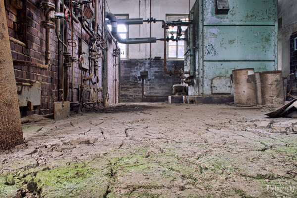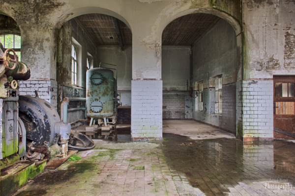 Rostige Maschinen mit leuchtend grünen Moosansätzen, abblätternde feuchte Wandfarbe und hier und da ein wenig Schimmel zauberten eine schöne Weltuntergangs Stimmung. Vor einigen Jahren muss hier einmal der nahe gelegene Fluss über die Ufer getreten sein und das ganze Gebäude unter Wasser gesetzt haben, denn der ganze Kellerboden war von Schlamm bedeckt.