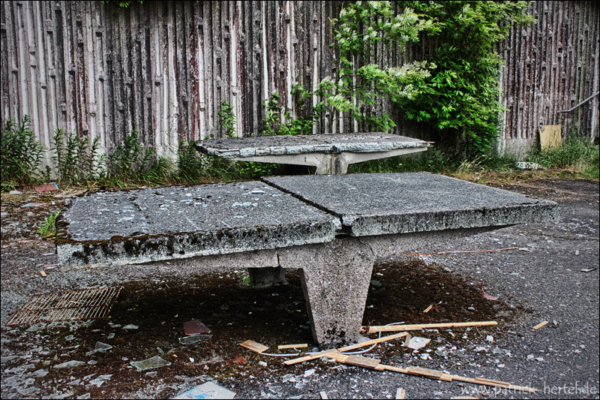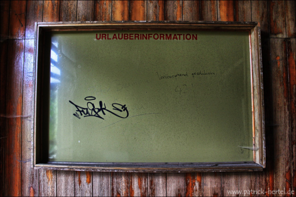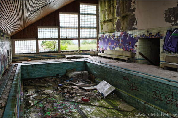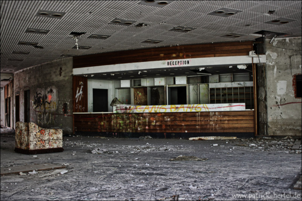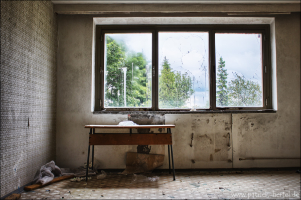 Da das Gebäude schon über 20 Jahre leer steht und ich schon ein wenig über den ausgiebigen Vandalismus gelesen hatte war ich ja auf einiges vorbereite. Aber als ich auf dem Gelände unterwegs war verging mir sehr schnell die Freude nach den ganzen Kleinigkeiten zu suchen. Rings um das Gebäude sah es so aus als ob jegliche Einrichtung hinaus geworfen wurde. Paintballer und Metalldiebe hatten auch schon an vielen Ecken ihre Spuren hinterlassen. Daher bin ich nur in der unteren Etage ein wenig umher gegangen und habe dann den wunderschönen Ausblick von der Dachterrasse genossen. Der Besuch vor dem baldigen Abriss des Gebäudes und dem Ausblick hat sich aber trotzdem gelohnt.