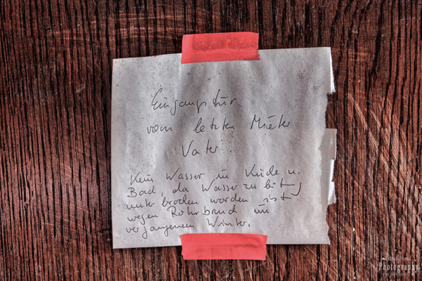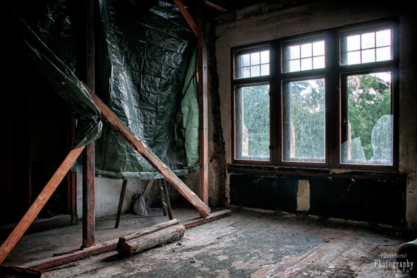 Eine Sanierung wurde bereits vom letzten Besitzer begonnen, leider aber bereits im Anfangsstadium wieder unterbrochen. Dennoch ist das Gebäude trotz jahrelangen Leerstandes in beachtlich gutem Zustand. Eines der Nebengebäude welches ehemals für die Bediensteten gedacht war haben wir nicht weiter erkundet, da in einem der Räume ein Schlafplatz eingerichtet war und wir nicht weiter stören wollten.
