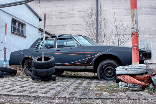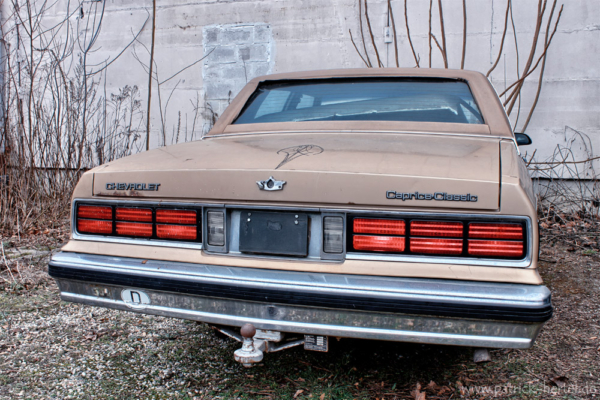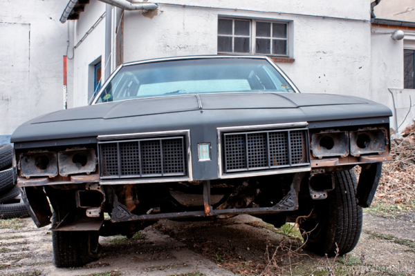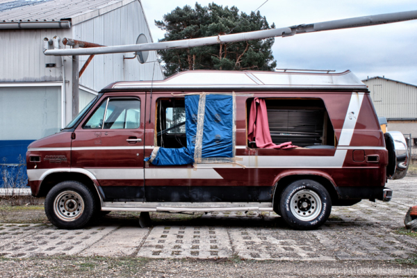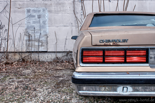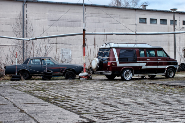 Da wird man im Februar bei Temperaturen um die Null Grad und einsetzender Dunkelheit mit Taschenlampe auf ein unbekanntes Gelände mit mehreren Lagerhallen geschickt um noch schnell Grillkohle und Anzünder zu holen, denn zum Superbowl passt ja Gegrilltes und Bier, aber statt der richtigen Halle findet man diese alten amerikanischen Schlitten. Ein Chevy Van G20, ein Chevrolet Caprice Classic und ein nicht identifizierbares Muscle-Car, die allesamt schon einiger Kleinteile beraubt wurden und trotzdem einen schönen Anblick hinterlassen. Dazu noch ein „Schneemobil“ mit Sirene und ein ausgebranntes Wrack.